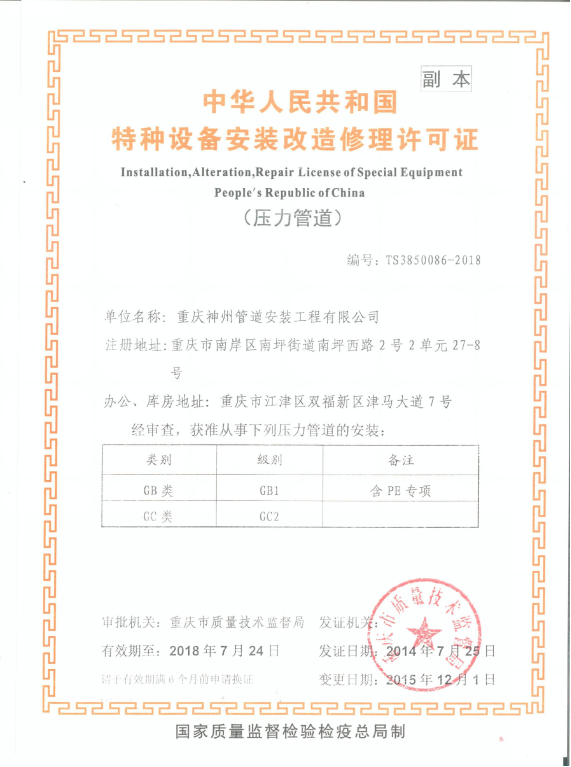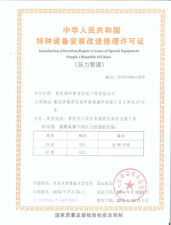 2015年12月3日,神州管道公司顺利取得了由重庆市质量技术监督局颁发的特种设备安装改造修理许可证!截至目前,神州管道公司压力管道安装改造修理许可范围包括GB1(含PE专项)、GC2,有效期至2018年7月24日。