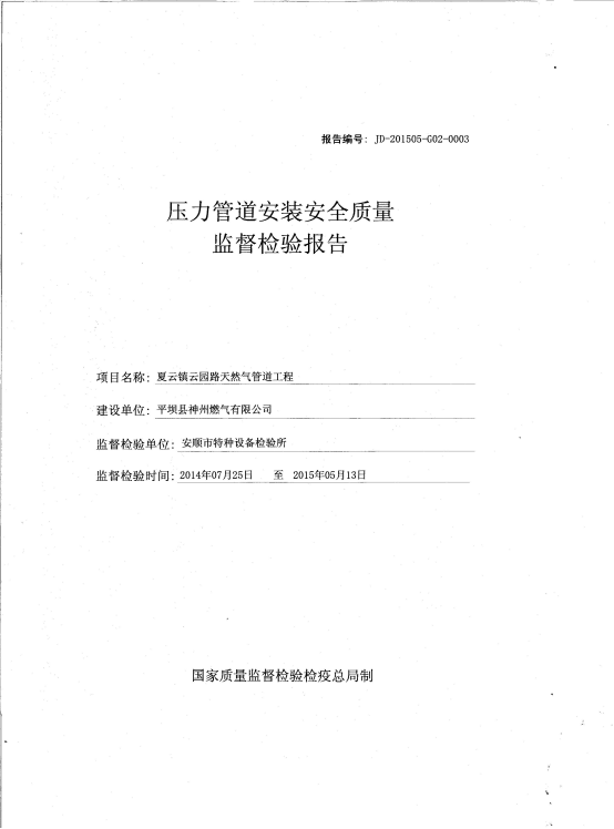 在公司上下的不懈努力下,于 5月18日成功取得了平坝白云气站—夏云团组输气管线工程、夏云十九路天然气管道工程、夏云镇云园路天然气管道工程的压力管道监督检验合格报告。