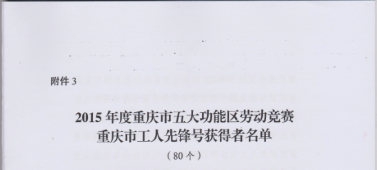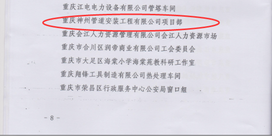 重庆神州管道安装工程有限公司项目部,在2015年度展现了爱岗敬业、开拓进取、攻坚克难的优良品格,以卓越的业绩带动公司发展,被重庆市总工会授予“工人先锋号”荣誉称号。这是公司自成立以来首次获此殊荣。