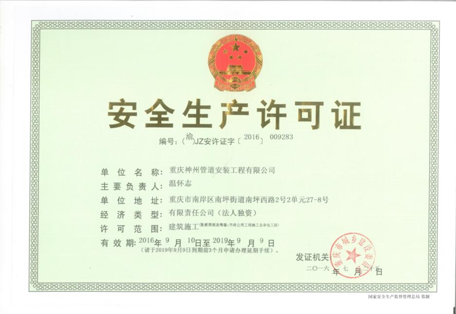 2016年9月21日,公司顺利通过重庆市城乡建设委员会的各项审核,成功取得《安全生产许可证》,获得建筑施工市场的安全准入资格。