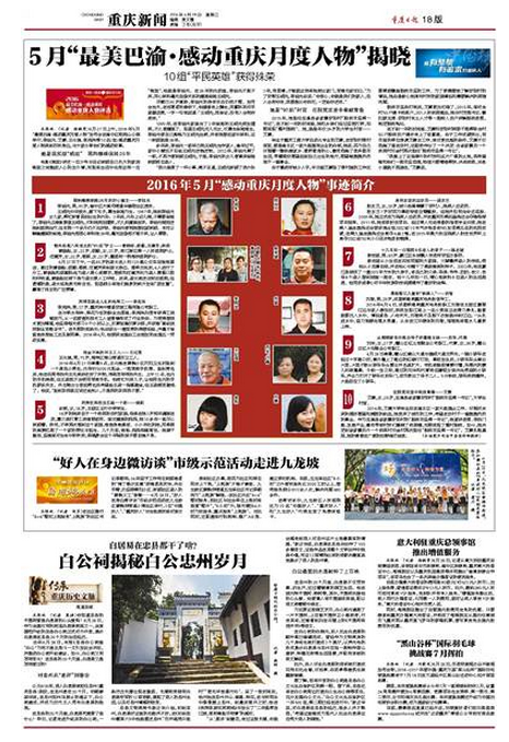 重庆日报6月29日第18版以“5月最美巴渝·感动重庆月度人物揭晓”的标题,报道了十大感动人物的简介,介绍了李宪洪“平民英雄”的先进事迹。