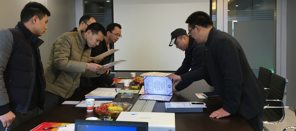 图一:龚部长一行在小会议室审查安装公司资质 |